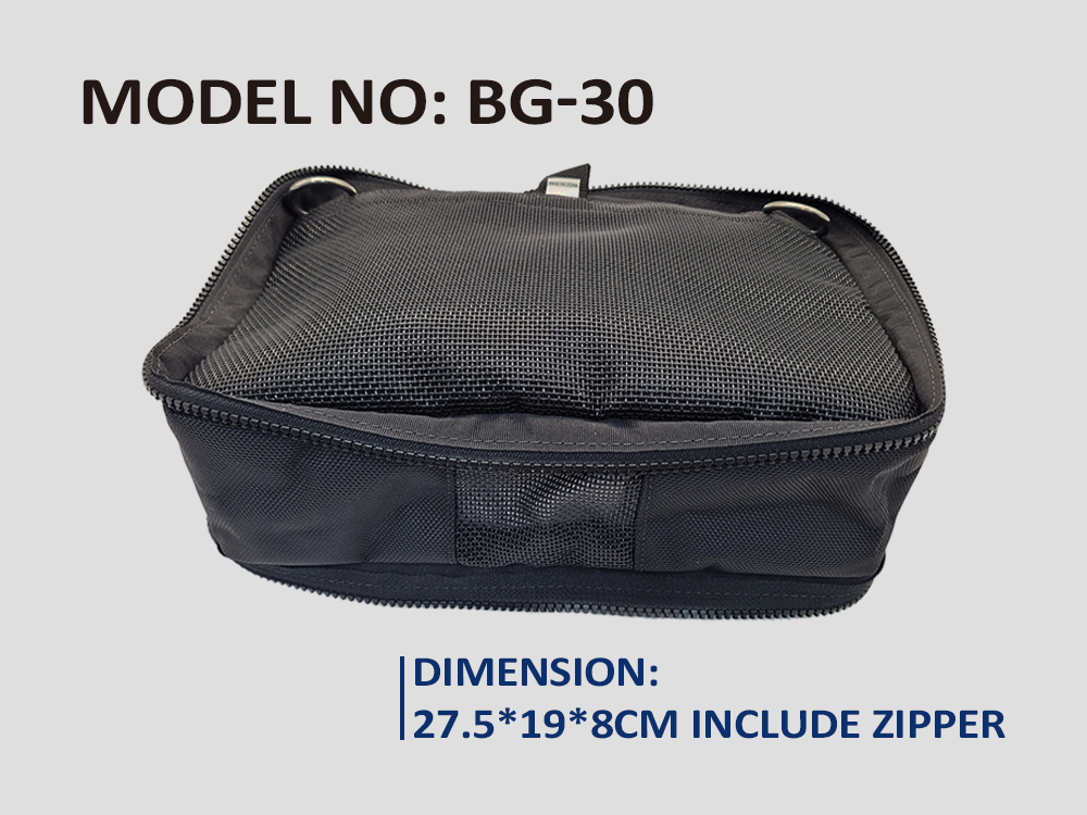 Side mount back pouch with one outer layer screening net and extra bottom net for water drain.