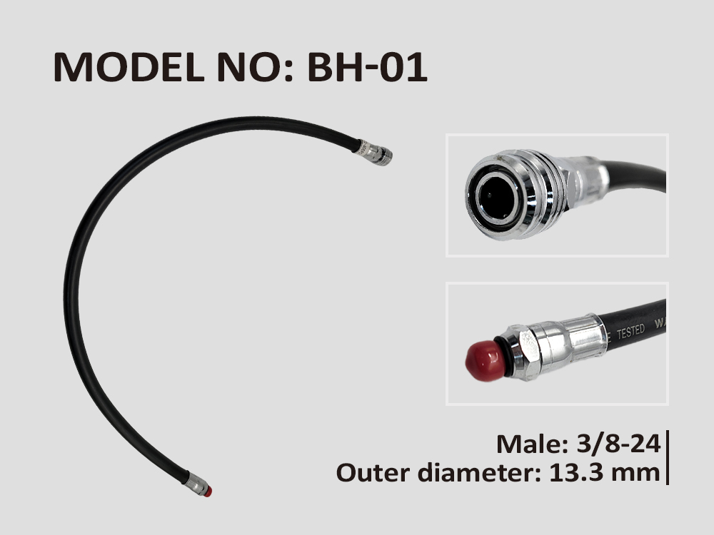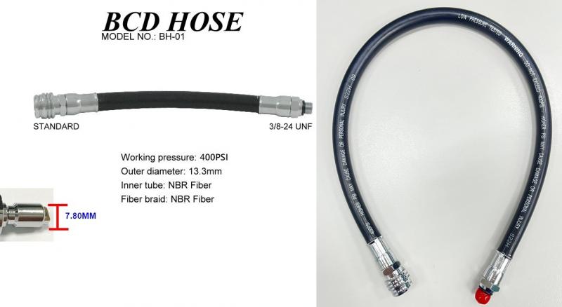 BC hose , low pressure hose Male: 3/8-24Female: StandardColor: BlackWorking pressure: 400 psiOuter diameter: 13.3 mmInner tube: NBRJacket: NBR