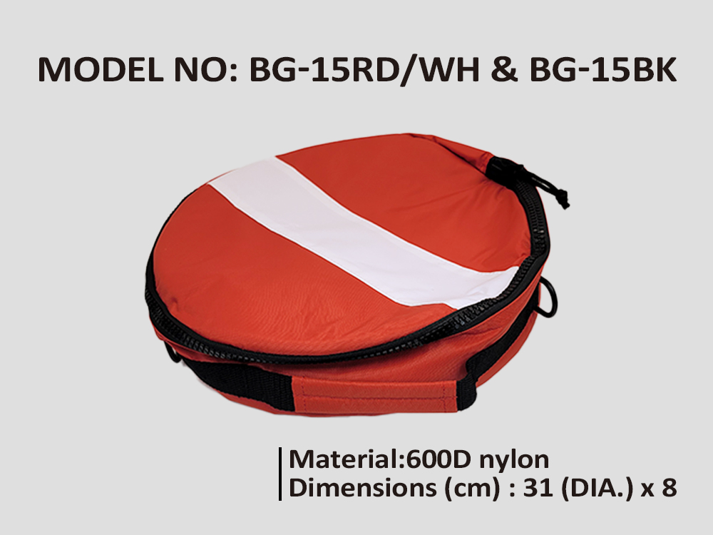 Scuba dive accessoryMaterial:600D nylonDimensions (CM) : 31 (DIA.) x 8Color: Red/White , Black
