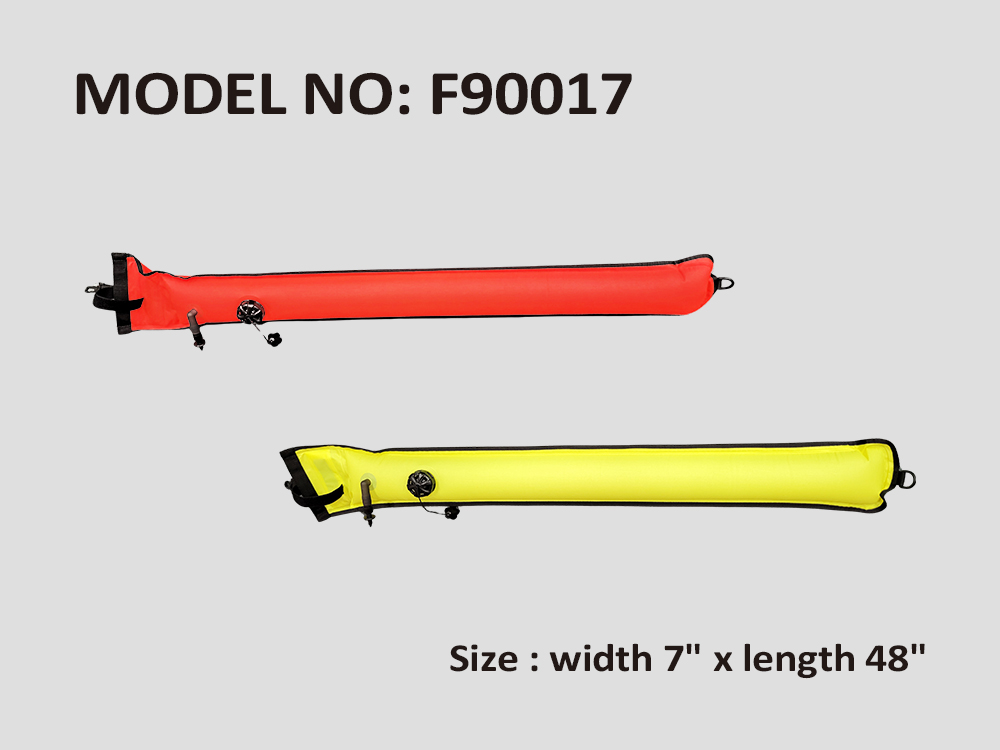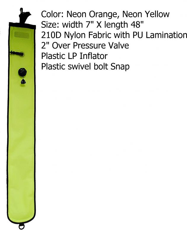 SCUBA DIVEColor: Neon Orange & Neon YellowSize : width 7" x length 48"210D Nylon Fabric with PU Lamination2" Over Pressure ValvePlastic LP InflatorPlastic swivel bolt Snapw / one way membrane