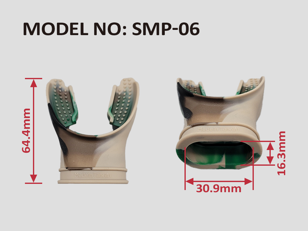 Regulator mouth pieceSIZE(MM):64.35(L) X55.70 (W)Colors: Mixed Camo, Black, Neon Pink,Blue, Camouflage, Grey, Pale Blue Accept Customization.