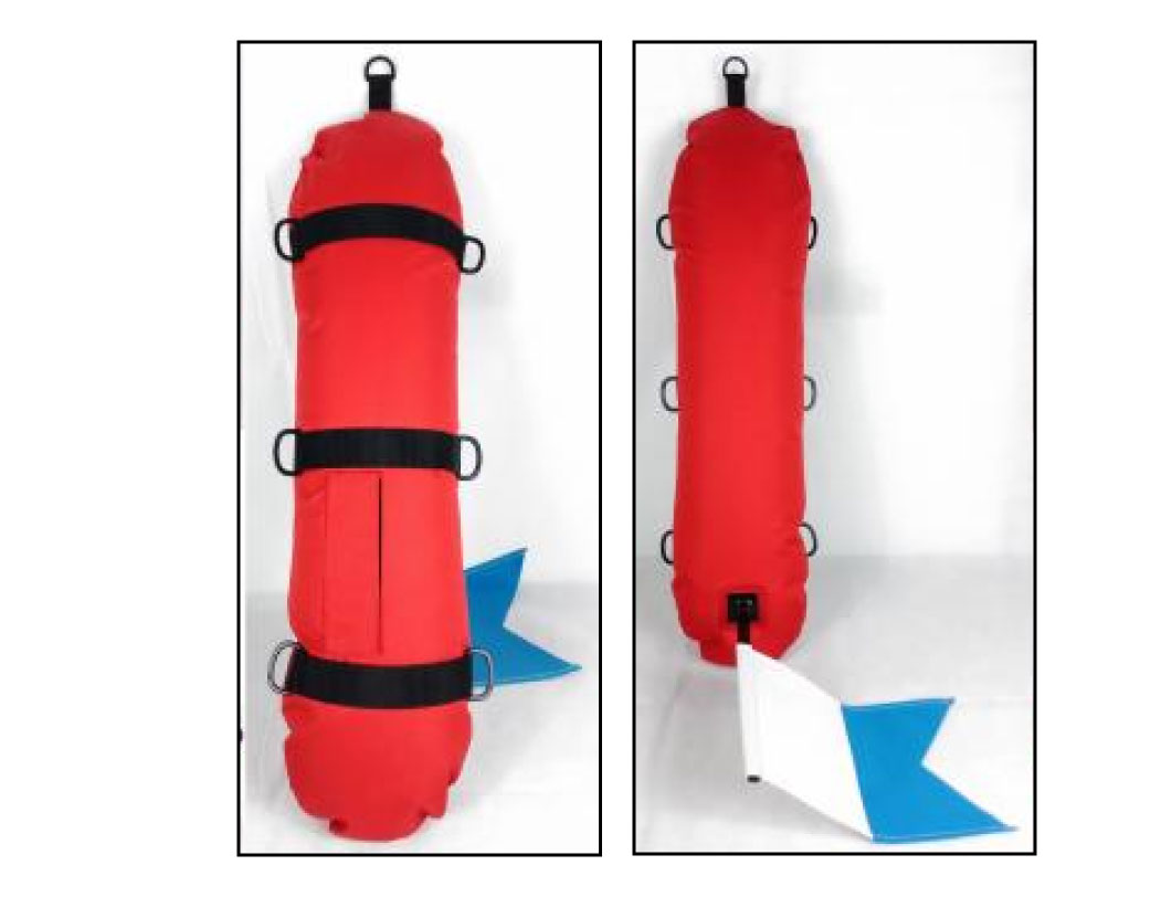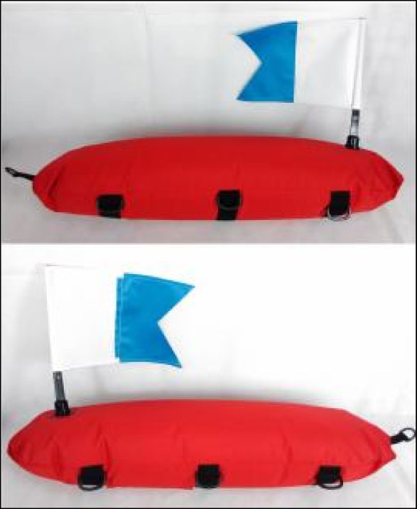 SCUBA DIVETorpedo buoy, 81cm x 28cm with Alfa flag 30cm x 20cmMaterial:inner bladder : PVC film outer bag: 600D polyester with PU coatingVolume: 17.5L